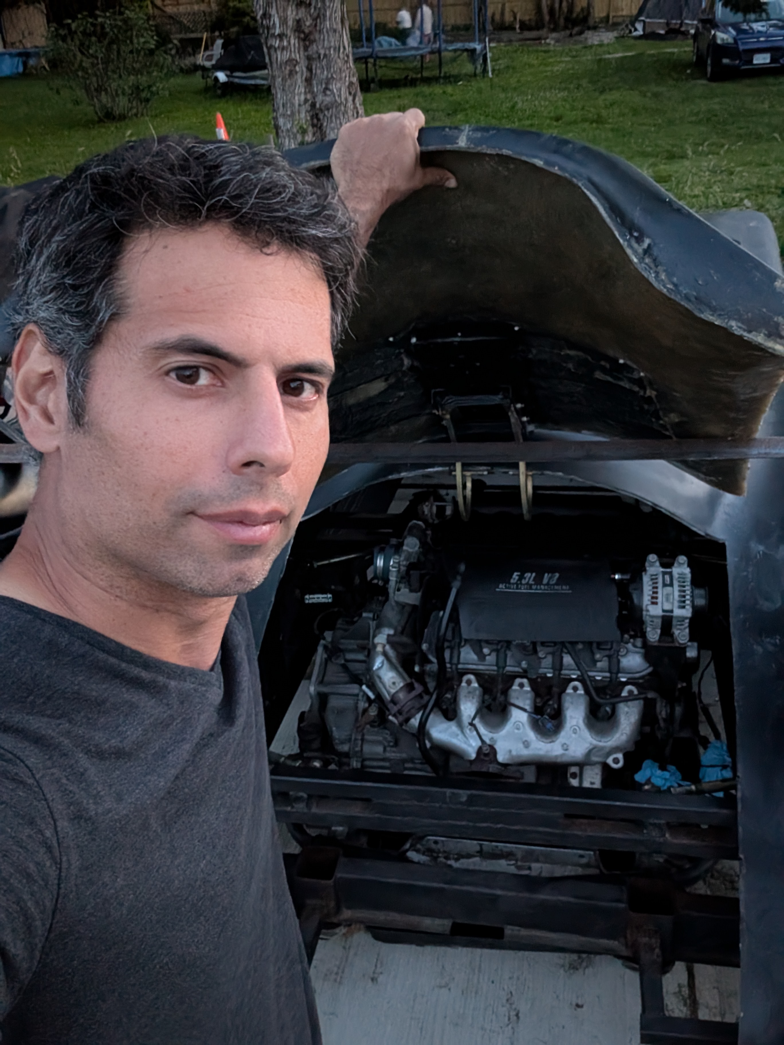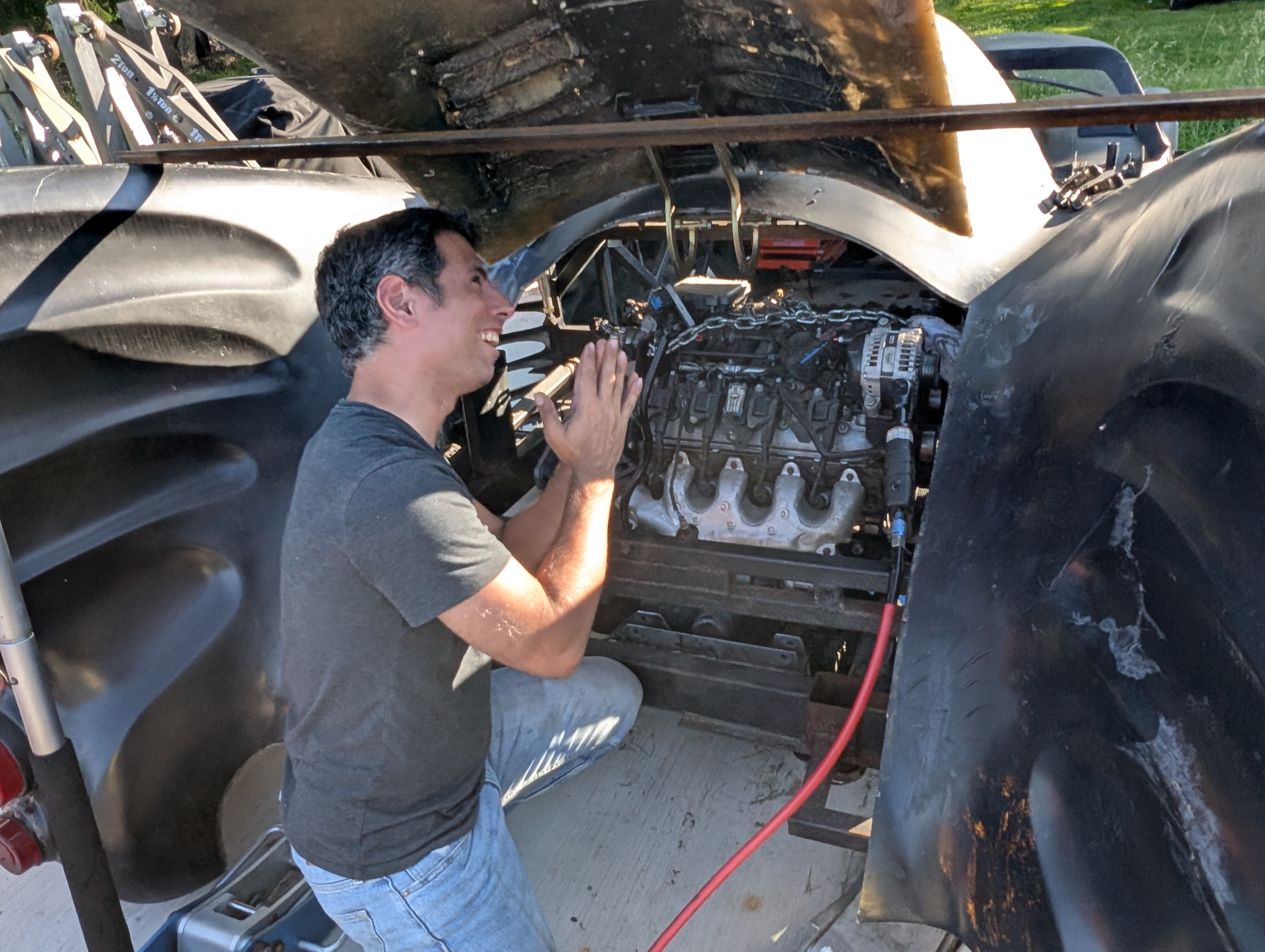 Pictures of engine in....I'm praying the alternator fits with trunk closed. Spoiler, it did. Already turned the engine. The computer was tuned proper. Now to add fuel cells and radiators. Cool thing is I can do work in the cockpit now, because my measurements were correct. You are seeing whats under the trunk. Wait until you all see whats under the hood. The engineering is falling away to the artistic side of things.