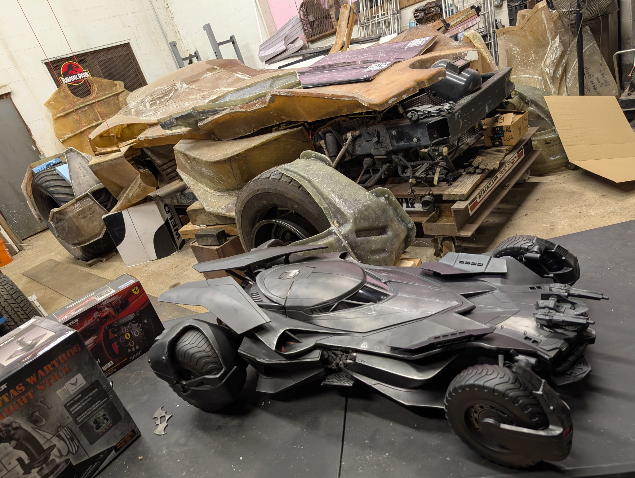 Took the wheel cover molds for our B vs S Batmobile out to Theman's shop a couple of weeks ago. Needed to check that the fit correctly on the tires before making the actual parts. Looks like they fit perfectly. Also delivered my 1/6 Model that came from Jazzinc. Looks great next to our car.