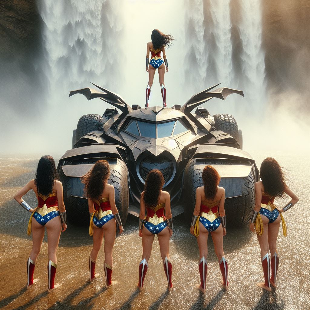 More perfection. Gotta love the extra metal hinge or whatever sticking out of the batmobile so the leftmost Wonder Woman can rest her foot.