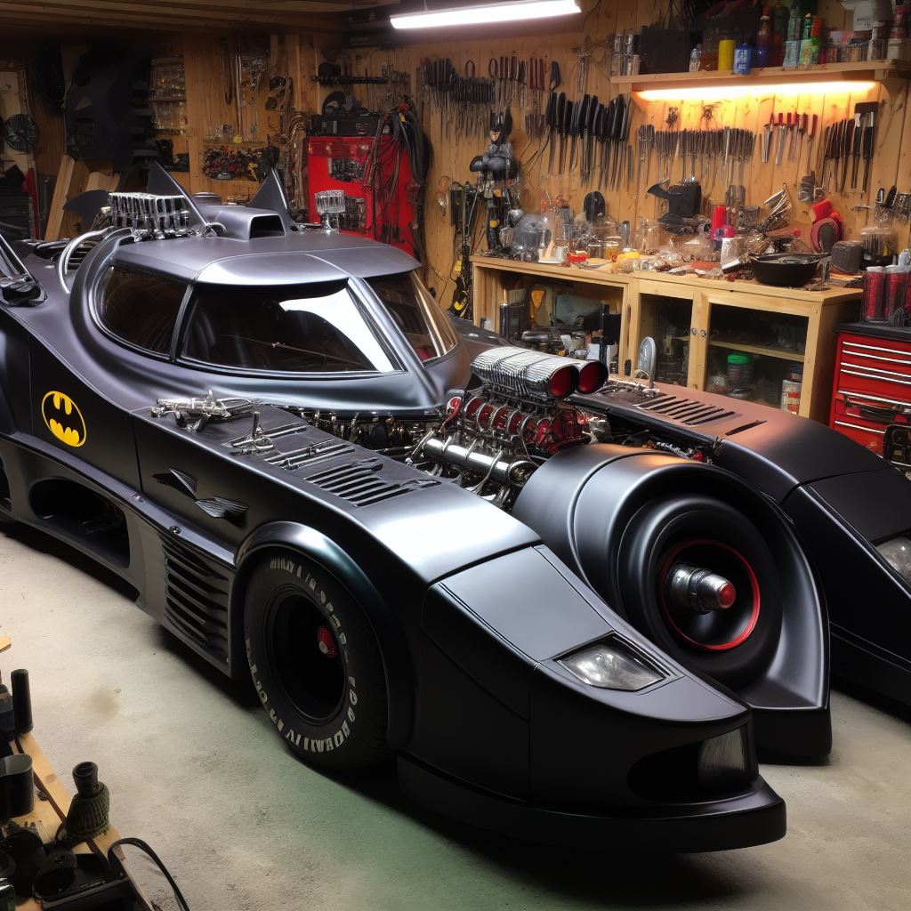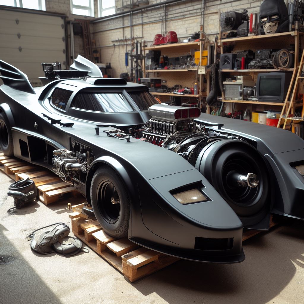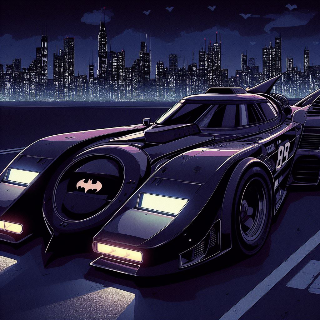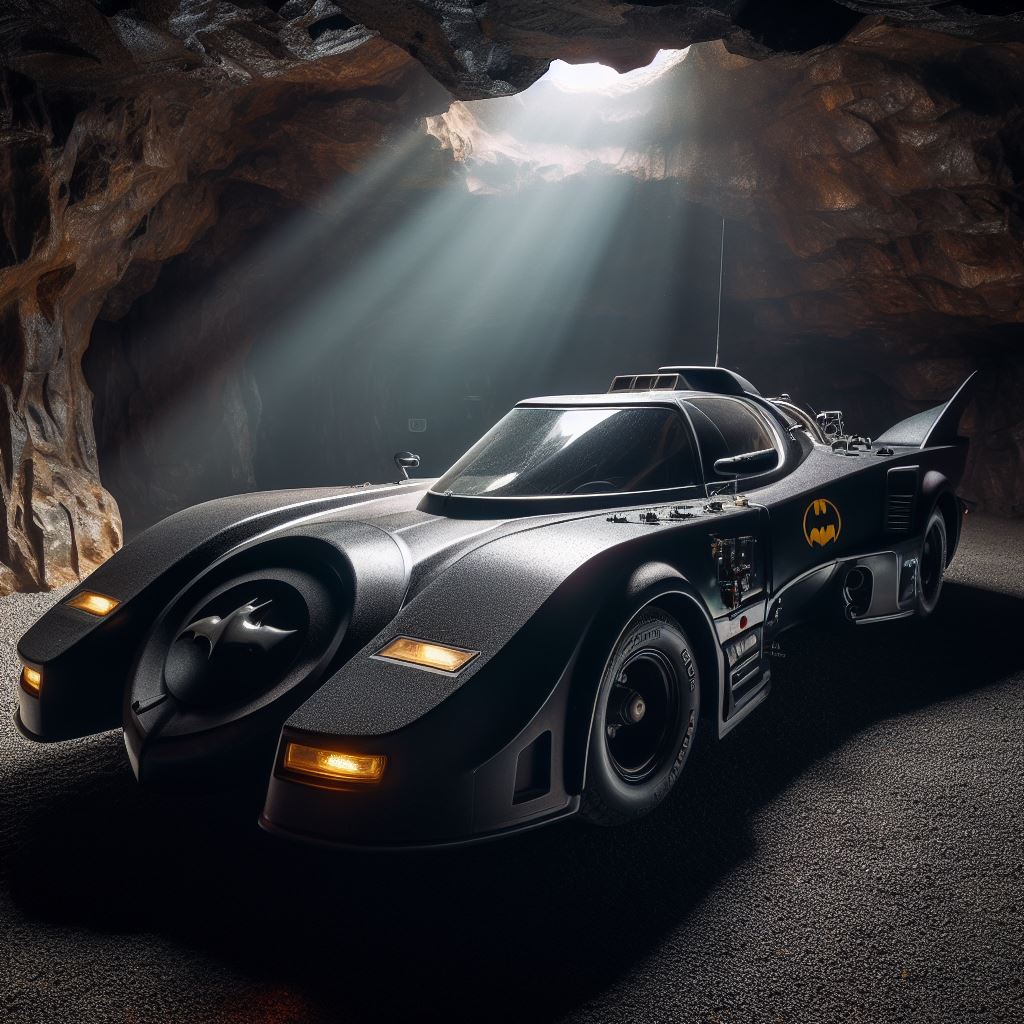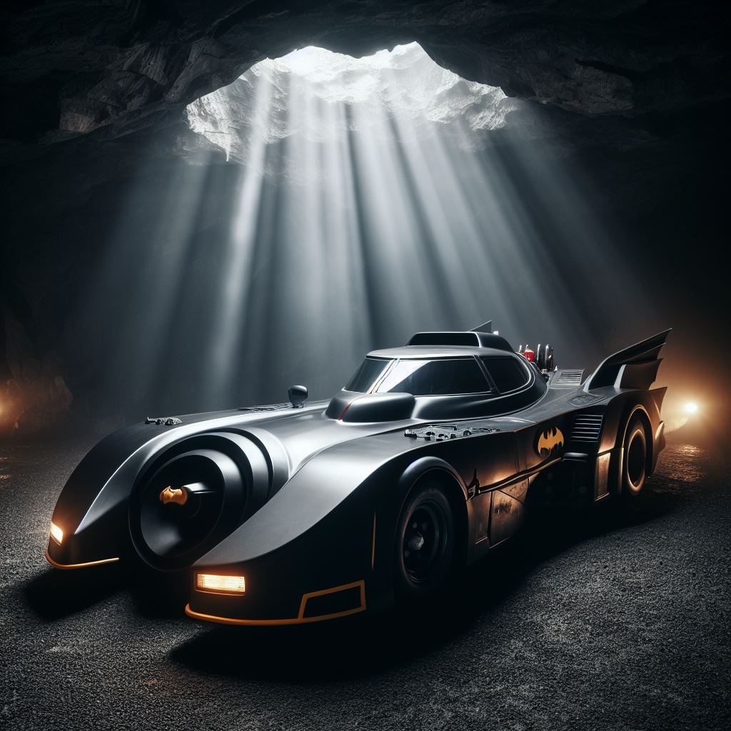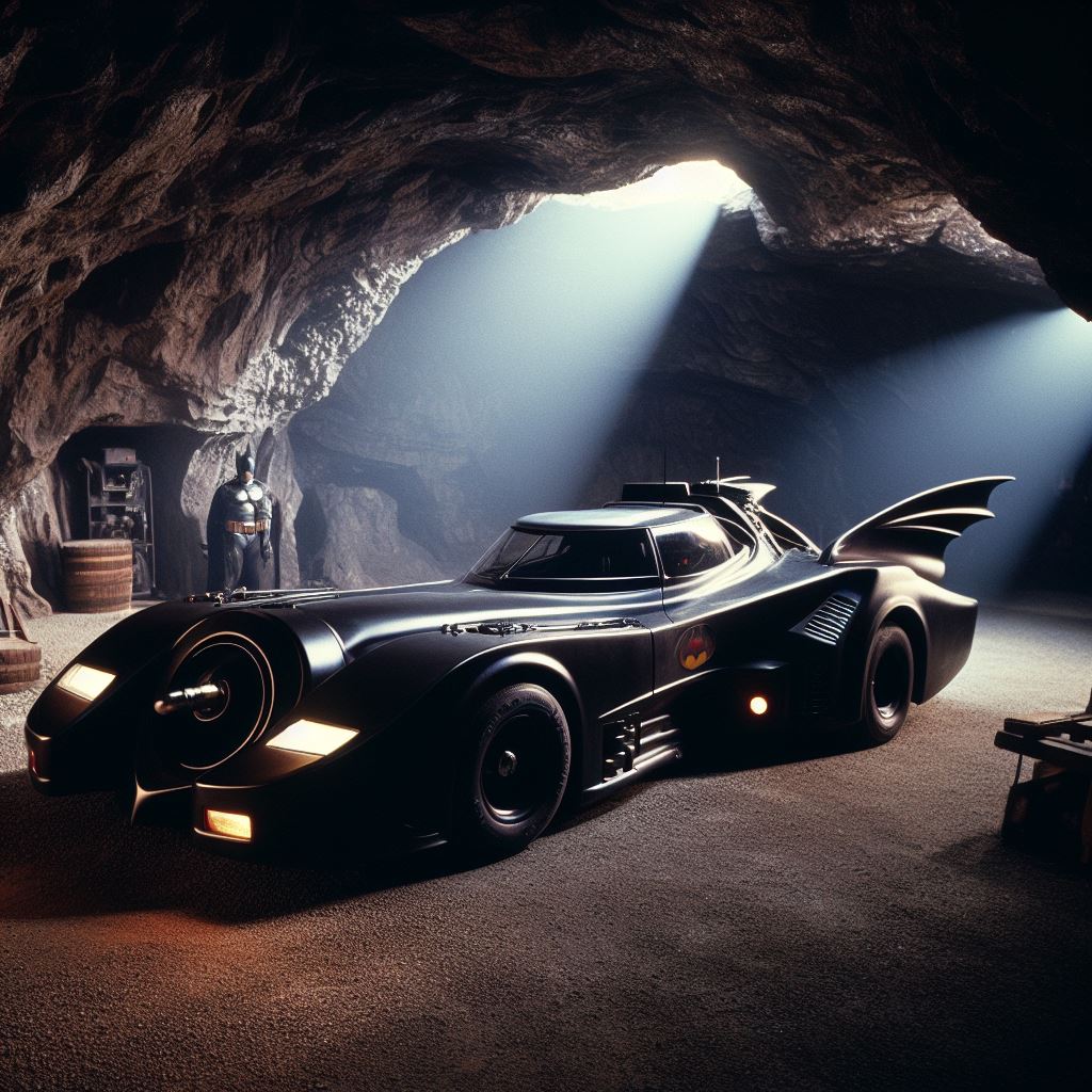 “1989 batmobile inside batcave, parked, light from sky shining on the car”