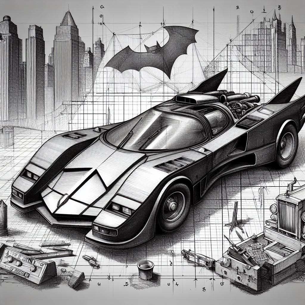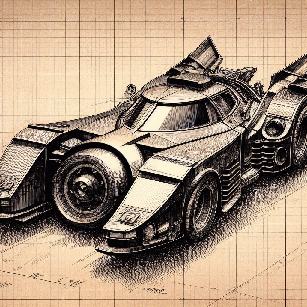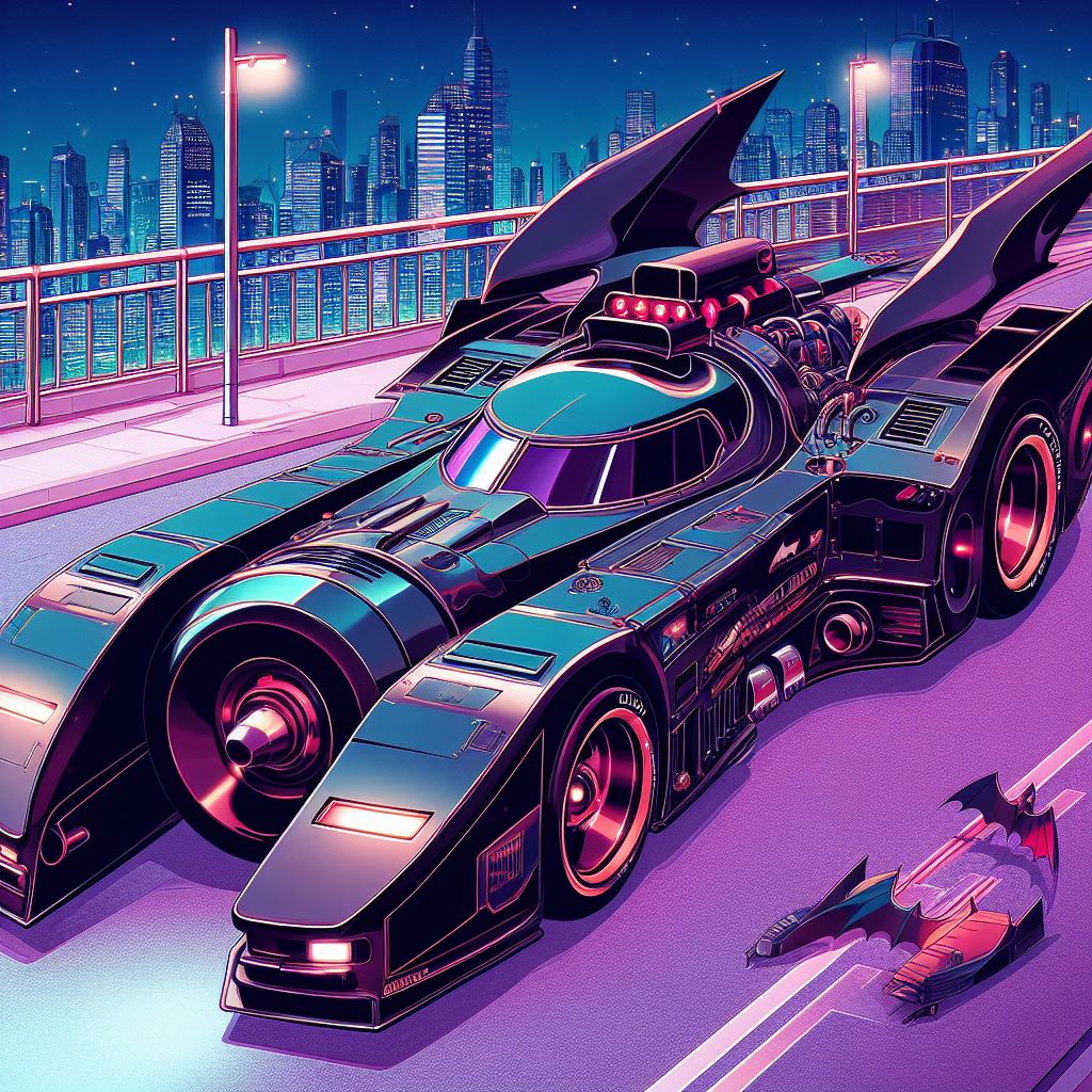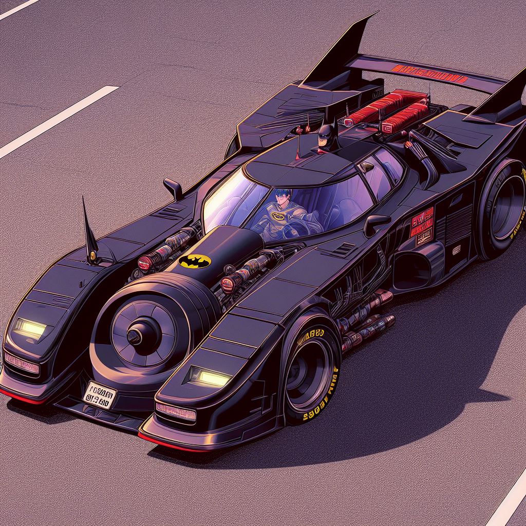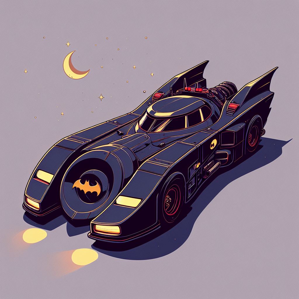 “1989 batmobile inside batcave, parked, light from sky shining on the car”