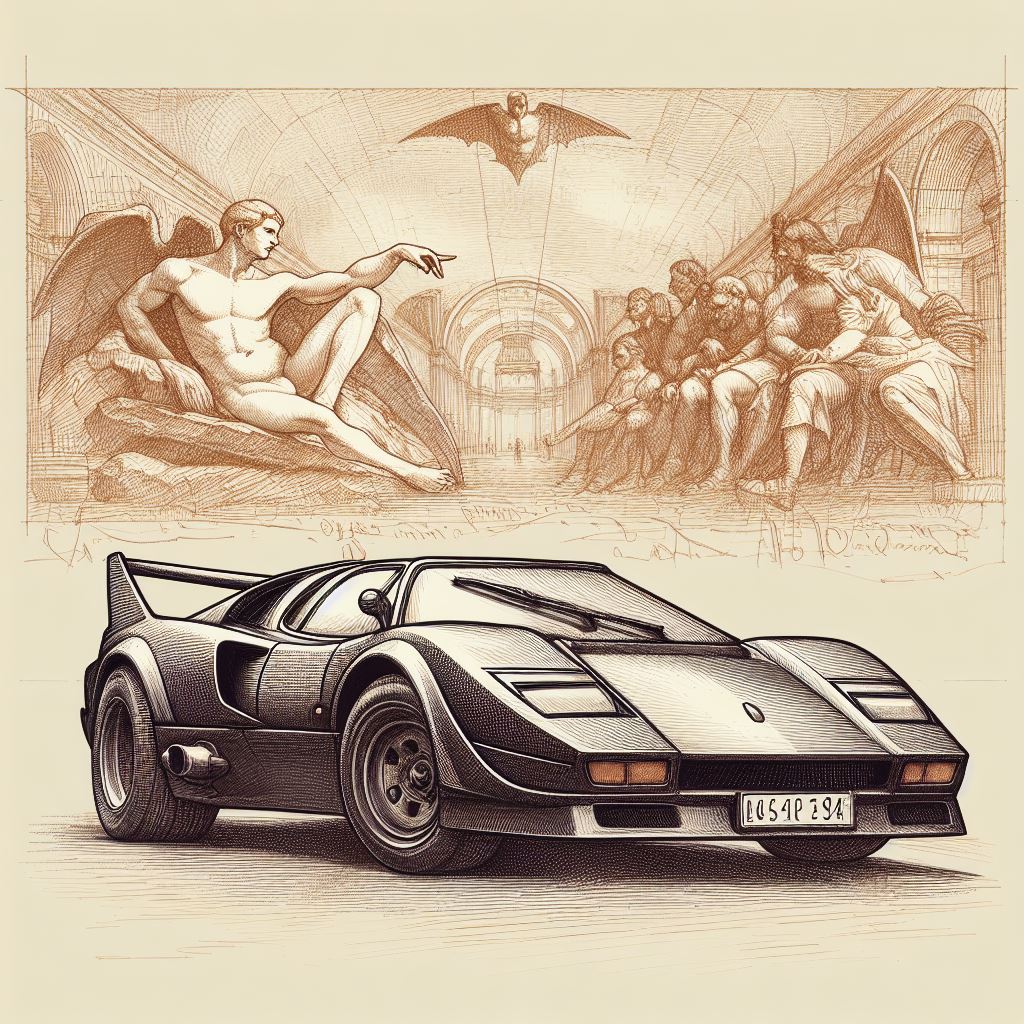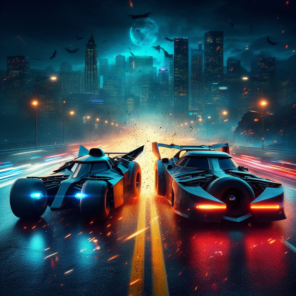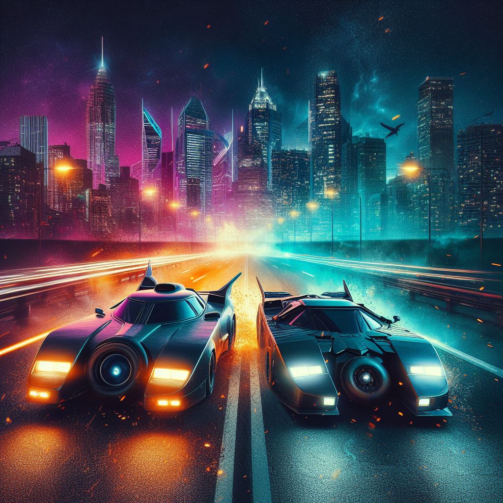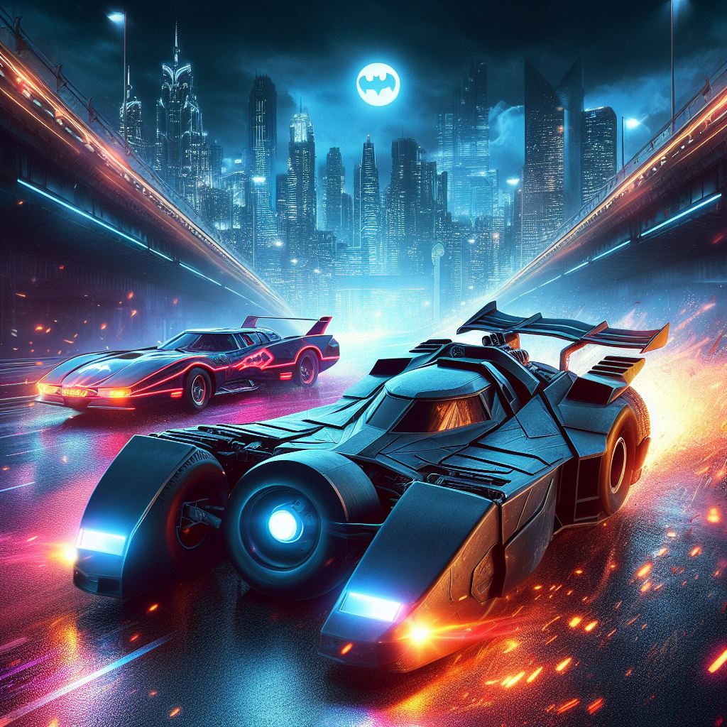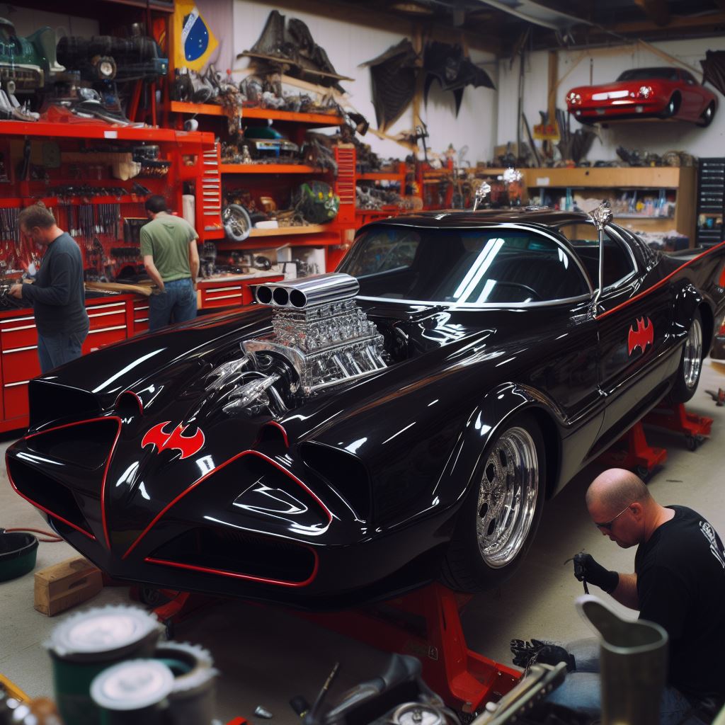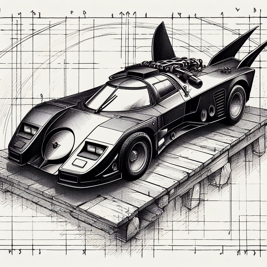 “1989 batmobile inside batcave, parked, light from sky shining on the car”
