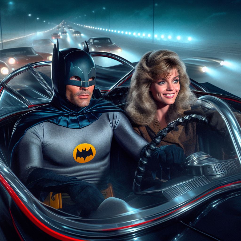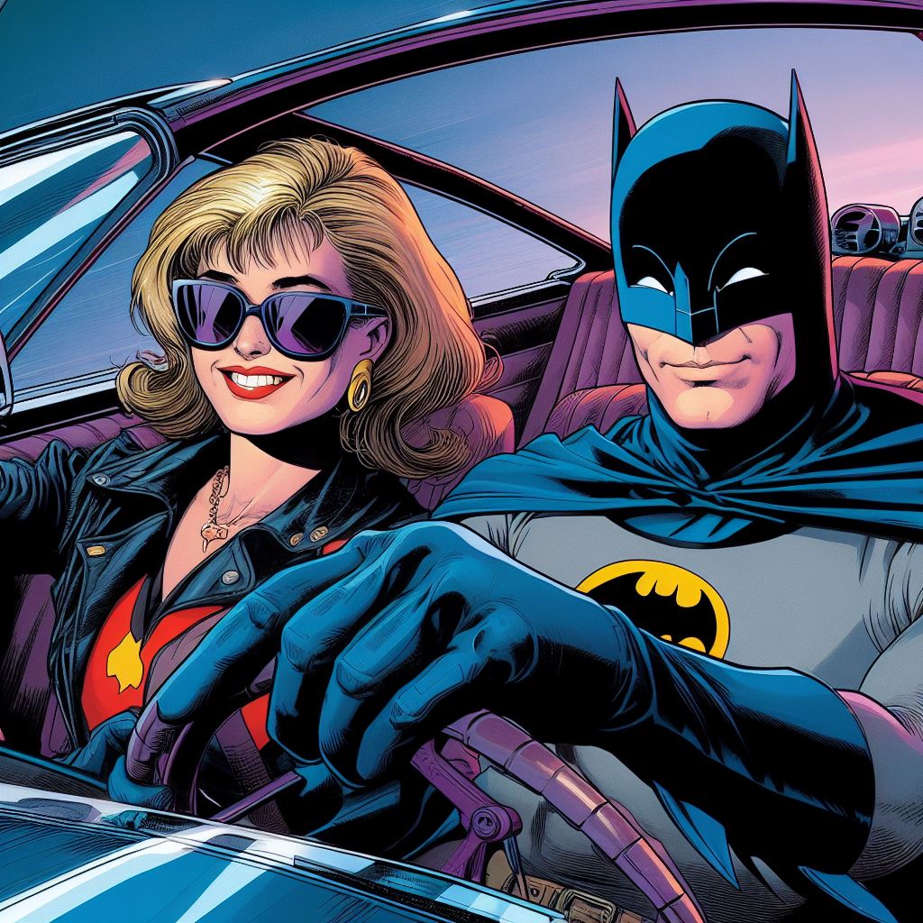 “Batman and Vicki vale cruising inside 1989 batmobile”